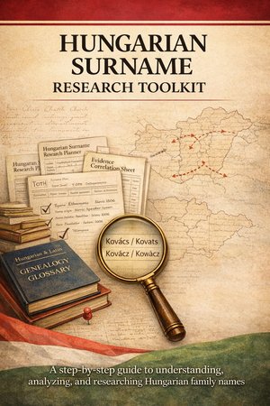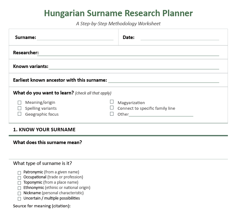 Plan, track, and verify your Hungarian surname research with printable worksheets, an Excel tracker, and completed sample editions.